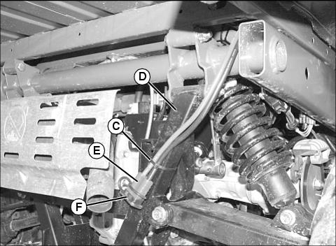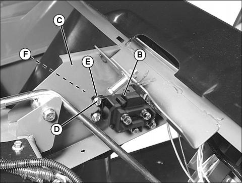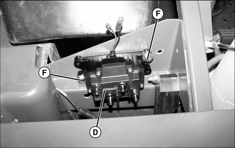 5. Install solenoid (D) with two 6 mm bolts (F) and washers, with a lockwasher and nut on rear side.