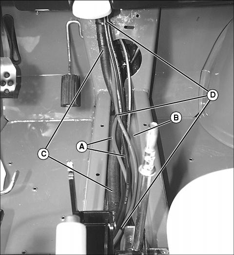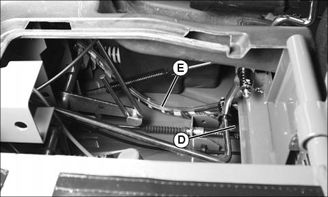 2. Route 1.6 m (64 in.) positive and negative battery cable wiring from battery through chassis tunnel (D) between seats. Pull harness through tunnel and up to solenoid. Tie off battery cable wiring to main harness (E), keeping wiring away from shift linkages and other moving parts.