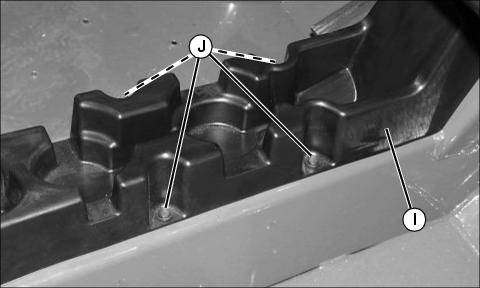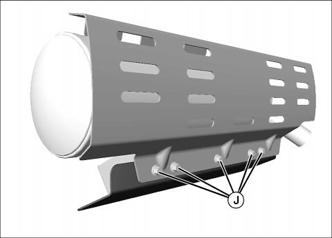 8. Secure the heat shield with five M6 self-tapping screws (J), installed from the rear, through the existing muffler shield into the optional heat shield.