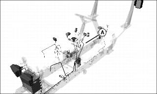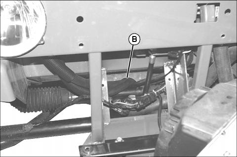 1. Route harness along main harness to rear of vehicle. Harness must go over rectangular frame crossmember (A), to the inside of the flange (B), then over the cargo box pivot tube. Let the end of the harness with connector hang down temporarily.