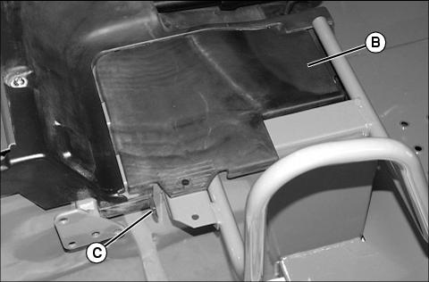 1. Locate service access panel (B) under passenger seat. Pull back on latch (C) and remove panel.