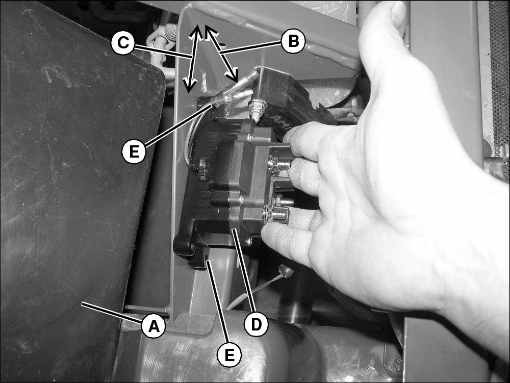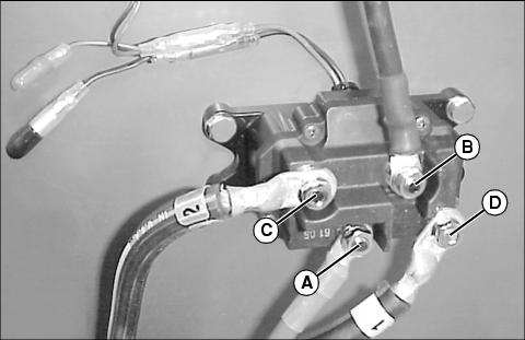2. Route positive cable (B) to solenoid (E) terminal. Route negative cable (A) to solenoid terminal.