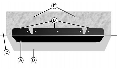 3. Measure up approximately 50 mm (2 in.) (B) and inward 42 mm (21/32 in.) (C) and position solenoid (D). Mark two holes (E).
