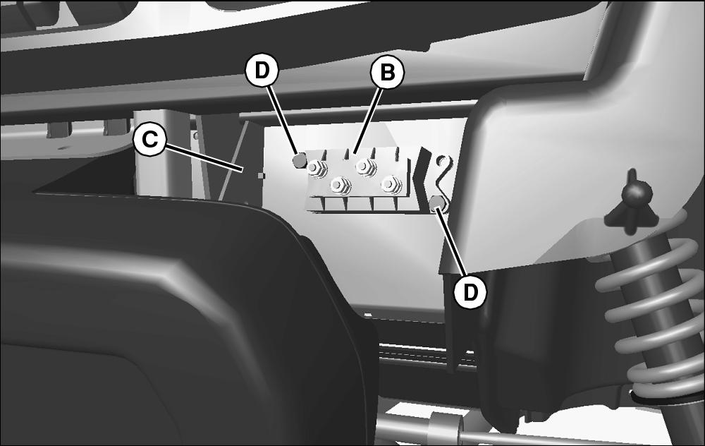2. For all models except M-Gator A1, secure rear mount wiring harness to machine main harness at center frame support using tie straps (D).