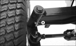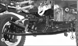 Lubricate grease fittings at both tie rod ends (A), and the front axle center pivot (B).
