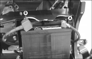 5. Push red cover (B) away from positive (+) battery cable and remove cable from battery.