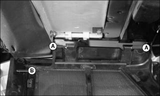 1. Install tabs (A) in bottom of side panels into grooves on machine frame. Install tab (B) in hole in fan shroud.