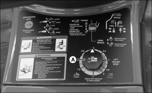 Use mower height control knob (A) to adjust mower cutting height, and lock mower deck lift arms in raised position. See your mower deck operator’s manual for instructions.