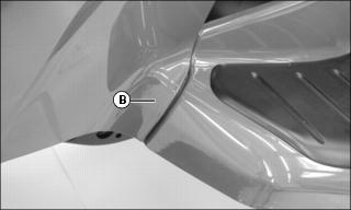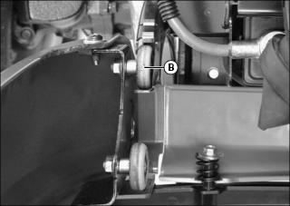 2. Check to be sure hood tabs (B) catch in frame on both sides of machine.