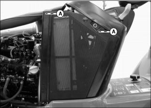 1. Install tabs (A) in bottom of side panels into grooves on machine frame. Install tab (B) in hole in fan shroud.
