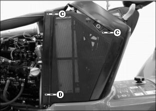 2. Push side panel lock pins (C) into holes in machine frame. Be sure tab (D) is secure in hole in fan shroud.
