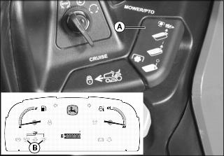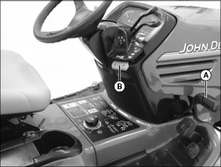 Use mower height control knob (A) to adjust mower cutting height, and lock mower deck lift arms in raised position. See your mower deck operator’s manual for instructions.