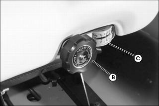 Turn knob (B) to desired position per operator weight on gauge (C).