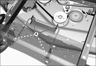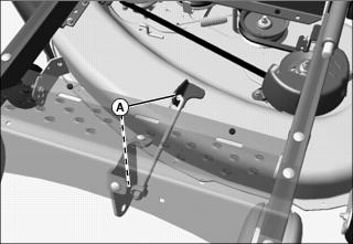 Lubricate the front lift arm at the points (A) where it pivots in the mower deck bracket as needed to prevent or minimize squeaking during operation.