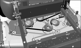 • Lubricate three mower deck spindle grease fittings (C) with two pumps of grease at specified interval.