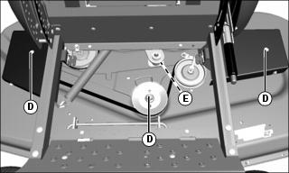 • Lubricate three mower deck spindle grease fittings (D) and idler arm (E) with two pumps of grease at specified interval.