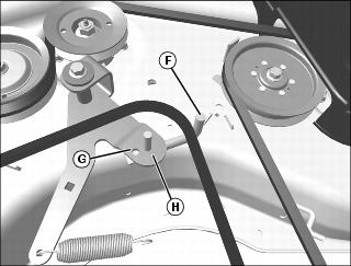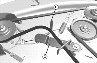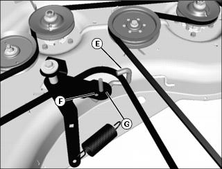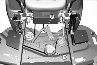 • Install 3/8 in. ratchet into square hole (F) in tension arm and rotate clockwise to release tension on belt, while installing mower belt onto center spindle sheave (G). Make sure that belt is properly seated on all sheaves.