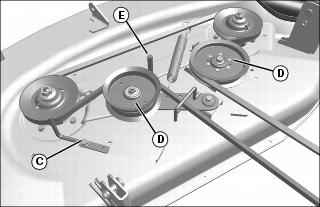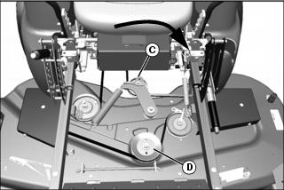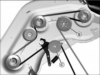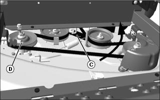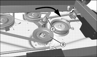 • Install 3/8-inch ratchet onto square hole (C) in tension arm and rotate clockwise to release tension on belt, while removing mower belt from center spindle sheave (D).