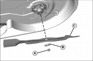 1. Align the splined center hole in the blade with the splined spindle shaft (G) and put the blade onto the mower spindle shaft with cutting edge toward ground.