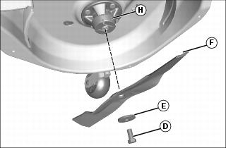 1. Make sure deflector cup (H) is seated properly between mower spindle and blade.