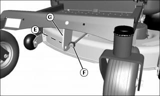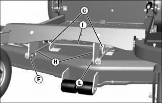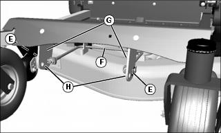 7. Remove locking clips (E), and remove front draft rod (F) from draft bracket (G) and mower deck bracket (H).