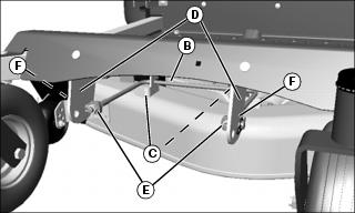 6. Install front draft rod (B) onto mower deck bracket (C) and onto draft bracket (D). Secure stud ends (E) with locking clip (F).
