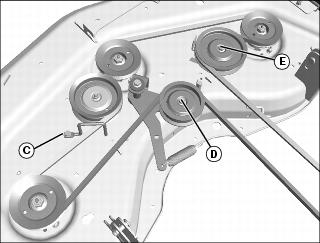 2. Unhook tensioning spring (C) from deck anchor bracket.