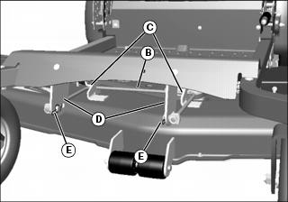 6. Install front draft rod (B) onto mower deck bracket (C) and onto the front set of holes in the draft bracket (D), form the outside. Secure draft rod stud ends with locking clips (E).