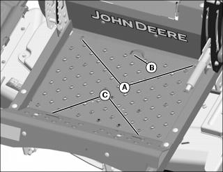 • Z200 series 42 and 48 inch mower decks: Loosen and remove nut (A), washer (B), and blade (C).