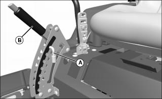 4. Remove pin (A), lower mower deck, and install pin just above lever (B) to lock mower in lowered position.