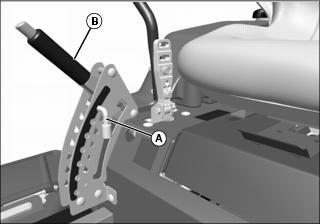 1. Be sure mower is fully raised to the transport lock position, as shown, and insert the pin (A) in the hole just below the mower deck lift lever (B).