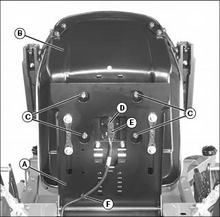 4. Plug wire harness connector (E) into switch. Route harness on bottom of seat and secure harness retainer (F) into hole in seat platform.