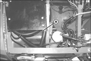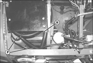 • Hose (H) goes from side radiator to front radiator.