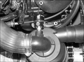 NOTE: You can check function of air restriction indicator by unscrewing indicator from air filter outlet tube and sucking on the indicator’s vacuum port with your mouth. The indicator window should show easy movement of indicator moving into the red zone and should remain there until the reset button (B) is pressed. If not, replace air restriction indicator.