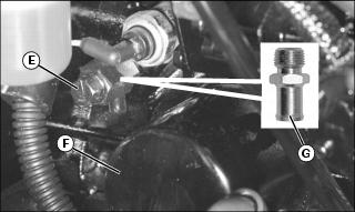 8. Check radiator hoses and air bleed hose at side radiator (F) and intermediate tube (G) for damage or cracking. Replace if necessary.