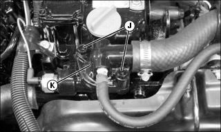 1. Remove screws (J) to remove thermostat housing (K), thermostat, and O-ring. Inspect and replace O-ring if necessary.