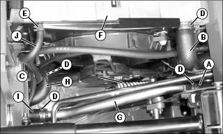 • Air bleed hose (J) goes from side radiator to de-aeration tank.