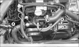 3. Remove hardware (A) and hose support (B) at top of belt guard. Loosen, do not remove, hardware (C) at bottom of belt guard. Lift belt guard (D) from vehicle.
