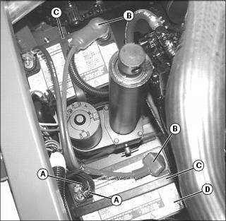 6. If right side battery (D) will be removed, release latches on air cleaner canister cover, and remove cover to provide clearance for battery removal.