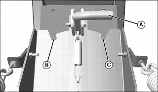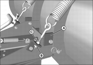 1. Adjust to initial setting by tightening locknuts (B) on eyebolts so 15 mm (9/16 in.) of thread is exposed. Tighten top nut (C).