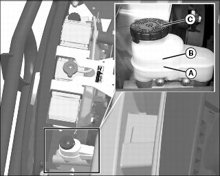 3. Visually check brake fluid reservoir. Brake fluid level must be between “MIN” (A) and “MAX” (B) marks. If fluid is low: