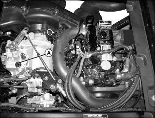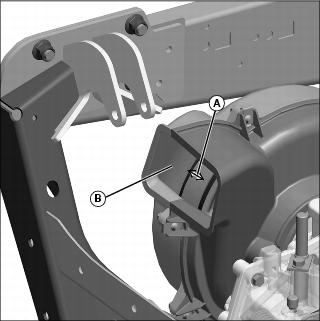 3. Under left side of vehicle, remove hose clamp (A) and pull air intake hose (B) off of outer clutch cover.
