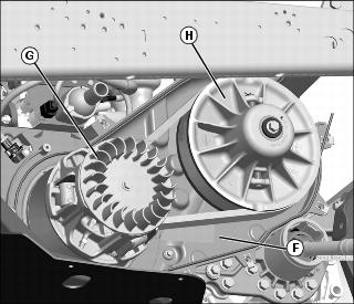 7. Clean inside clutch enclosure cover, clutch enclosure base (F), and around drive (G) and driven clutch (H) assemblies.