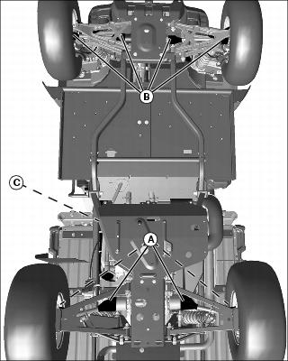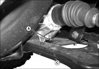 5. Remove 4WD front differential drain plug (A) and allow oil to drain through opening (C) in frame and into drain pan.