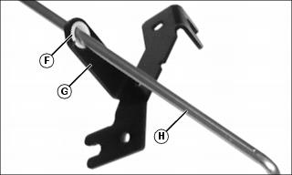 2. Insert snap-in bearing (F) into chute and spout bracket (G), with wider flange of bearing on handle side of bracket. Slide chute and spout bracket onto chute handle rod (H).