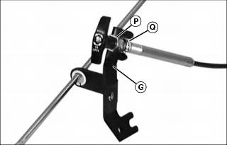 6. Put handle end of cable into top slot of chute and spout bracket (G) with lock washer and nut (Q) against bottom side of bracket.