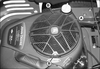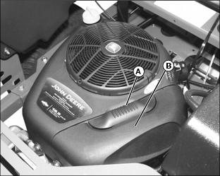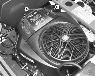 1. Locate rotating screen guard (A) at top of engine, and the two retaining tabs (B), embossed with a finger symbol.