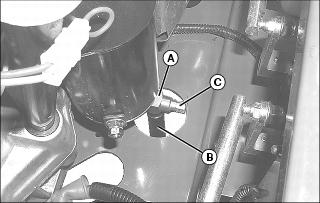 3. Wipe dirt from around oil filter (C). Place a drain pan under oil filter, and remove old filter.