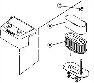 7. Remove foam precleaner (B), wing nuts (C), and paper element (D). Inspect paper element.