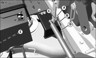 • Remove spring locking clip (A) on rod end (B), then remove rod end from pivot pin (C). Turn rod end on rod (D) in (clockwise) to decrease forward creep and out (counterclockwise) to decrease reverse creep. Repeat procedure, as necessary, on opposite side (E). Install rod ends back onto arms and secure with spring locking clips.